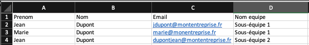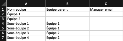 Nous allons vous proposer un exemple simple de deux équipes, avec chacune, 2 sous-équipes. S'il n'est pas précisé qu'une colonne est facultative, c'est qu'il est obligatoire de la remplir.
