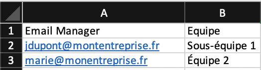 - Doit correspondre à un email de la colonne "Email" de la feuille "Utilisateurs". Tout manager doit impérativement être déclaré en tant qu'utilisateur de Weview, s'il n'est pas dans la feuille "Utilisateurs", vous ne pouvez pas mettre son email ici.